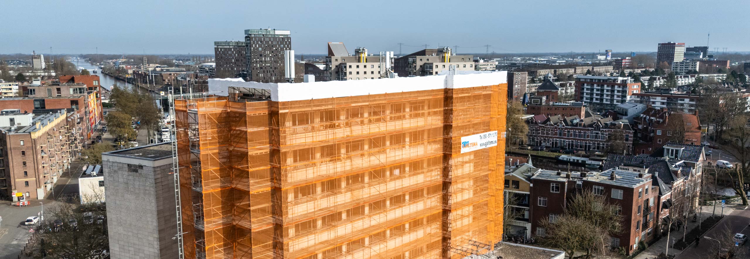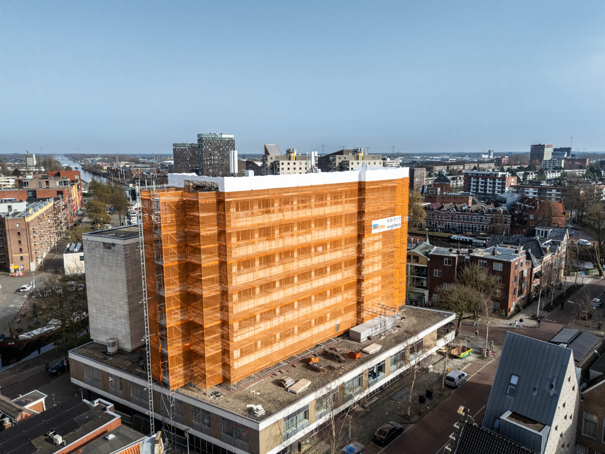De steiger is netjes afgewerkt met een kapconstructie, zodat werkzaamheden ongehinderd door kunnen gaan, ongeacht de weersomstandigheden. Rondom zijn netten aangebracht voor extra veiligheid én een verzorgde uitstraling van het project.