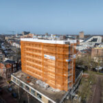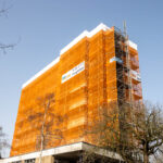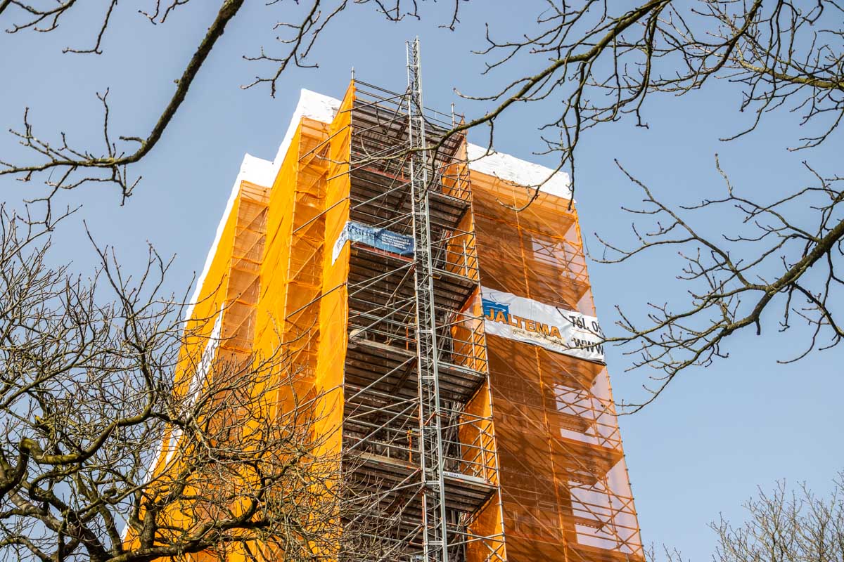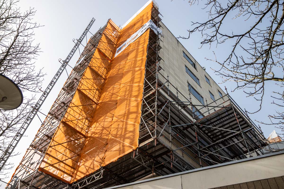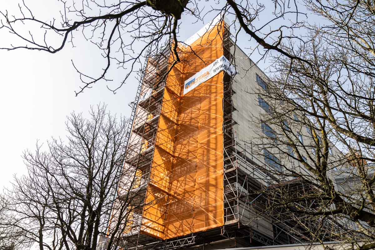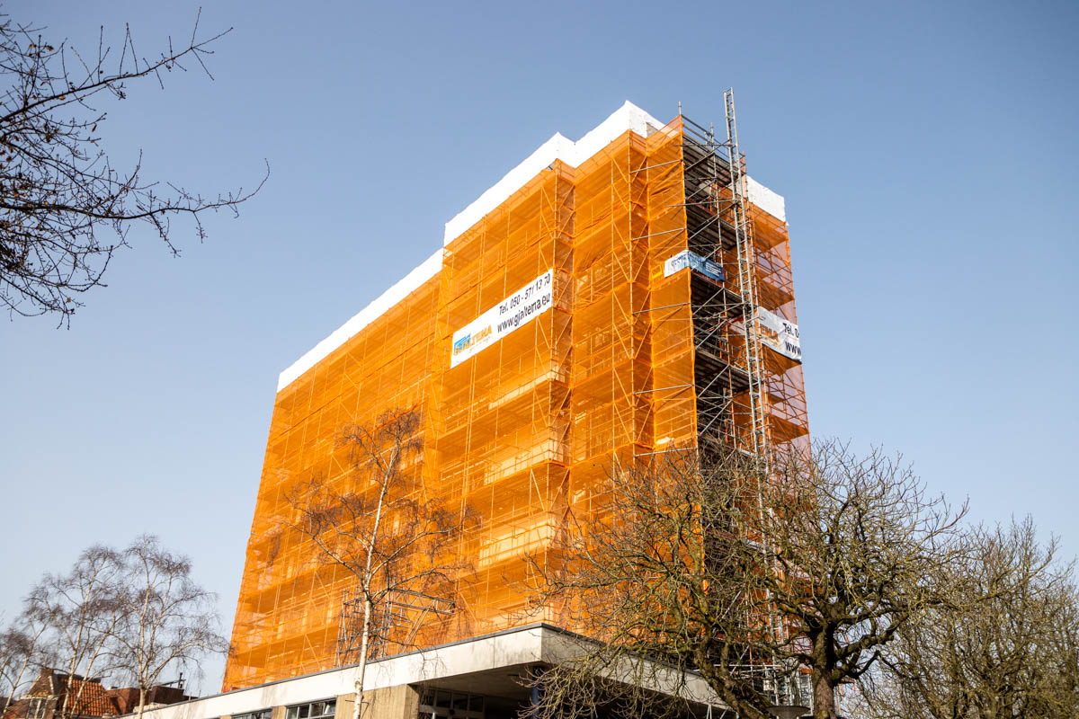 Gjaltema Montagebedrijf heeft de gevelsteiger volledig getekend en berekend. Om het gewicht van de constructie optimaal te verdelen, is de steiger doorgestempeld binnen het gebouw. Daarnaast zijn er twee bouwliften gemonteerd bij de steiger, waardoor materialen en vakmensen snel op de juiste werkhoogte komen.