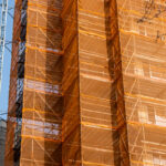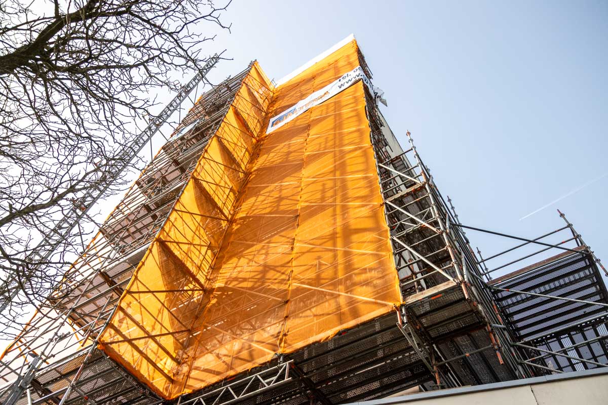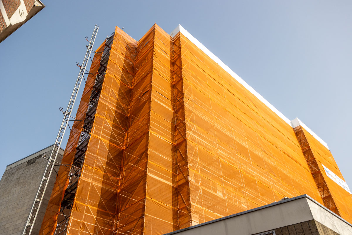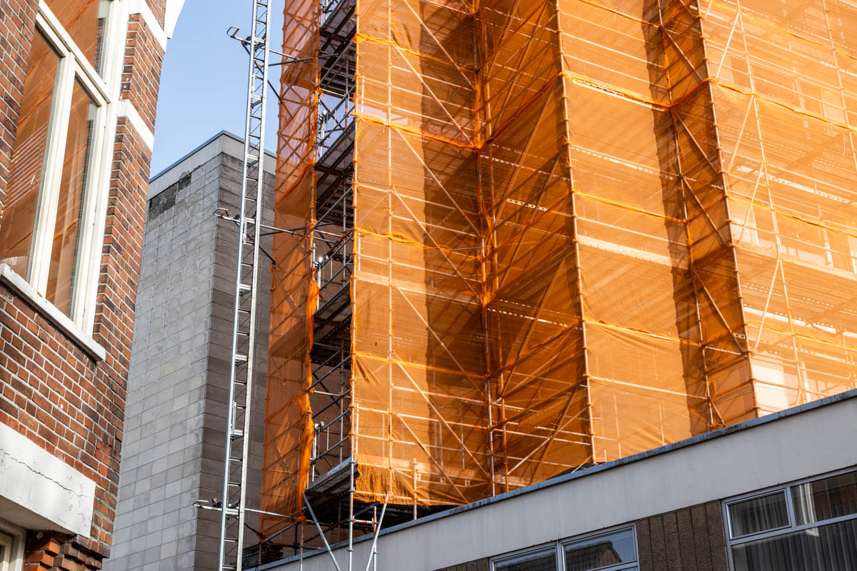 Op de beelden is de eerste fase van de steiger te zien. In een later stadium wordt de volgende fase gerealiseerd, waarna de steiger het volledige pand rondom zal omsluiten.